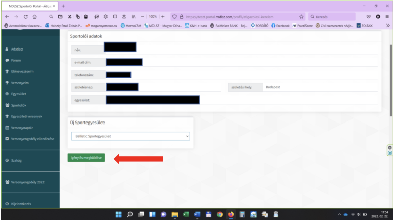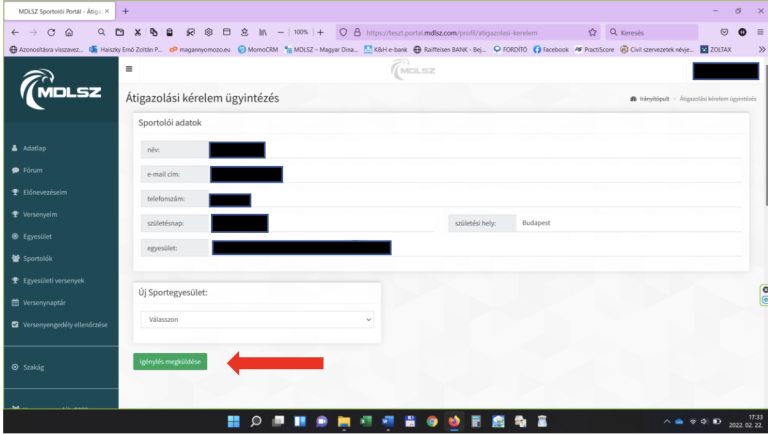 A klubvezető vagy ahol van, ott a kapcsolattartó a kék színű, Kérelem gombra kattintva megnyithatja magát a kérelmet, ellenőrizheti, hogy pontosan milyen tartalmú átigazolási kérelmet adott be egy másik klub versenyzője.