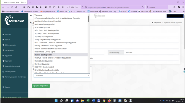 A kérelem megnyitásakor a sportoló adatai betöltődnek a rendszerből, a versenyzőnek annyi dolga van, hogy azokat ellenőrzi, majd az adatlapon, az ÚJ SPORTEGYESÜLET gomb megnyomásával megnyílik a legördülő menü, innen kiválasztja annak az egyesületnek a nevét, ahova igazolni kíván, majd egy alkalommal a kiválasztott egyesület nevére kattint. (lásd alul)