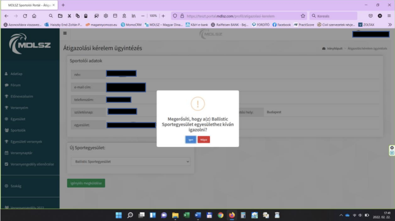 A kívánt új egyesület megadását, majd az IGEN gomb megnyomását követően az „Átigazolás beküldése” gomb egy alkalommal történő megnyomásával, a rendszer a versenyző által kitöltött igénylést digitális formában megküldi a versenyző jelenlegi klubelnökének.