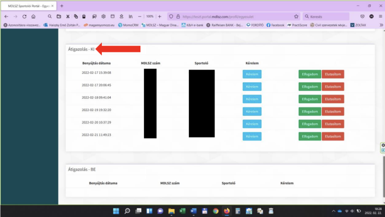Ezután a lap legalján, a Számlák, Jóváhagyásra váró fegyvervásárlási kérelmek, Évközi minősítek, felirat alatti részbe bekerültek az Átigazolások – KI, valamint az Átigazolások – BE feliratú részek. Amennyiben érkezik a klubból történő eligazolásra irányuló Átigazolási kérelem, akkor azok itt, az Átigazolások – KI felirat alatt lesznek felsorolva egymás alatt.