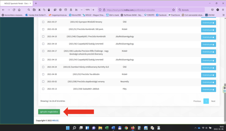 – A szükséges adatok megadását követően a lap alján, baloldalon található, zöld színű „Igénylés megküldése” gomb egy alkalommal történő megnyomásával, a rendszer a versenyző által kitöltött igénylést digitális formában megküldi a versenyző klubja elnökének. (versenyzőnek ebben a helyzetben több tennivalója nincs)